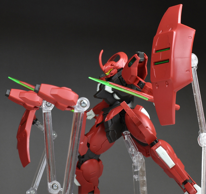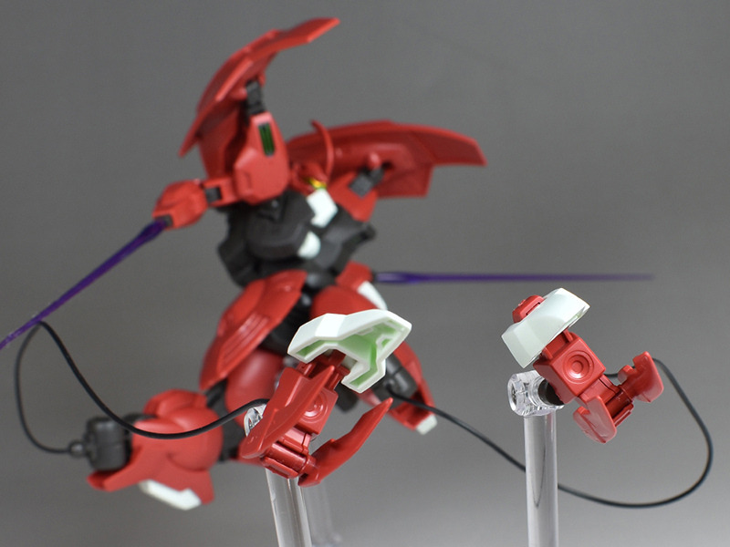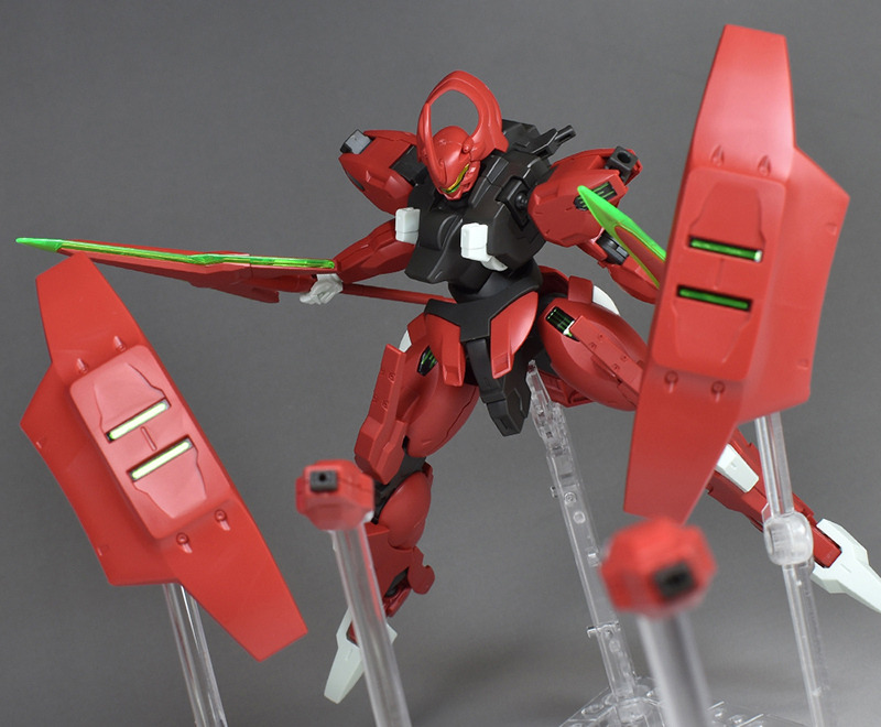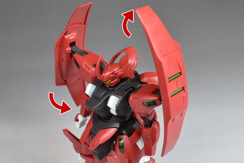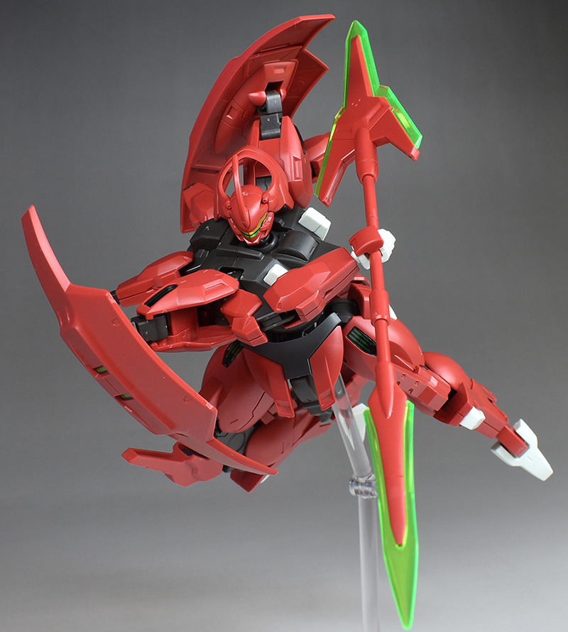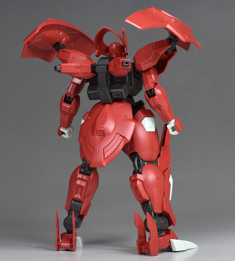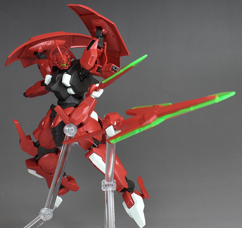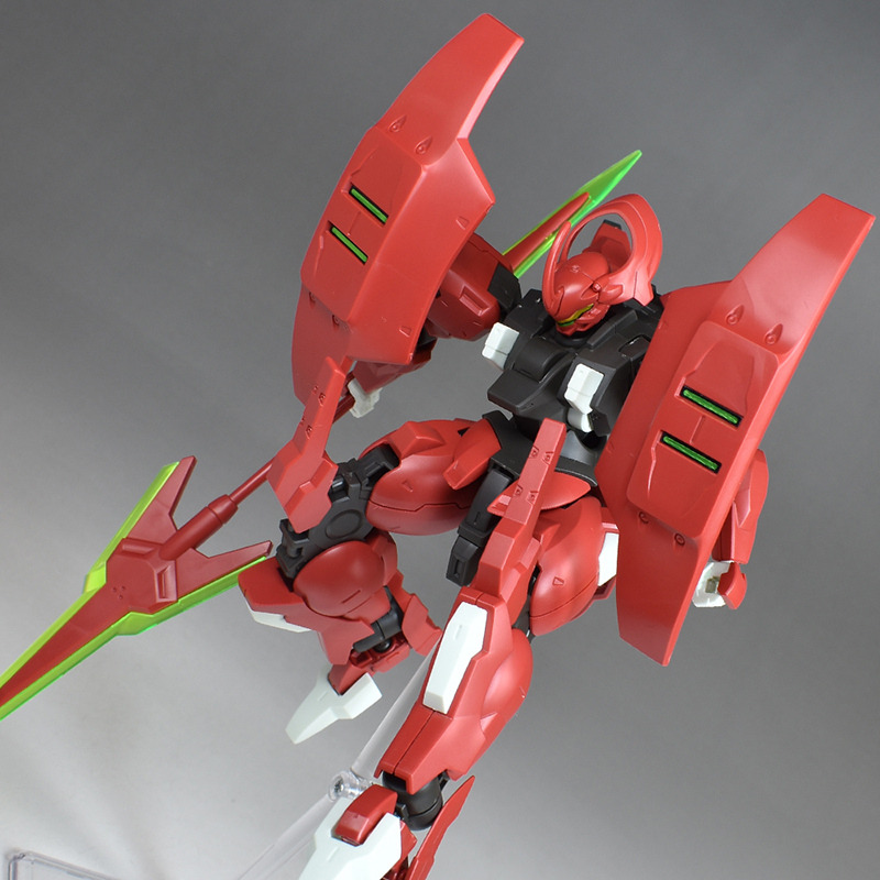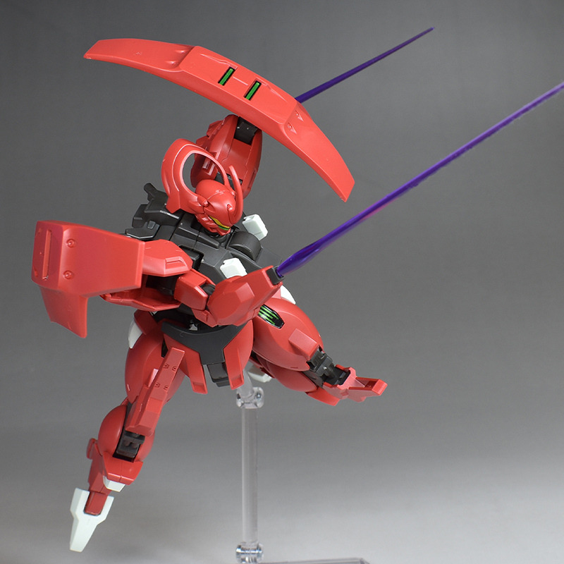 Although the red coloring is not unusual for Gundam, the red fuselage still has an impact, and the included armament with its many variations, such as the Ishvira, Shackle Crow, and Beam Javelin, is quite playful. The shoulder ambiker also has a strong presence, and is one of the items that gives a sense of sculptural beauty even when posed.