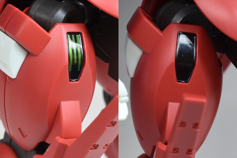 胸部、肩部、アンビカー、大腿部のシェルユニットを黒いシールに変更して。クリアパーツはピンセットなどで外しやすかったですが、シールがピンセットだと欠けたり破れたりしやすく、貼替えが少し難しかったです。予め発光と非発光をチョイスして変更しないようにするか、2体用意して発光、非発光を再現するなどしたほうがいいかも。