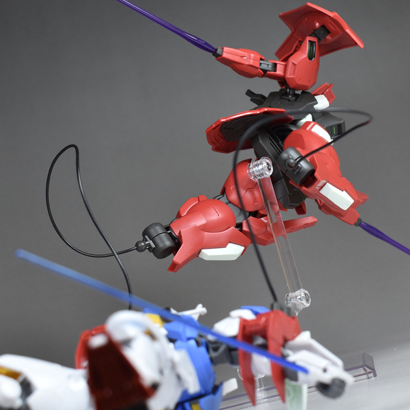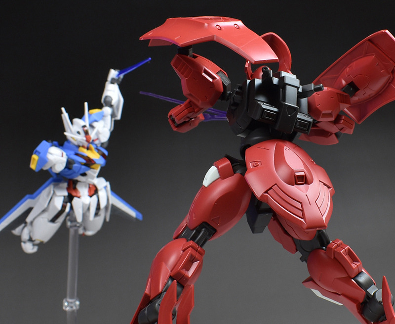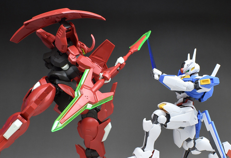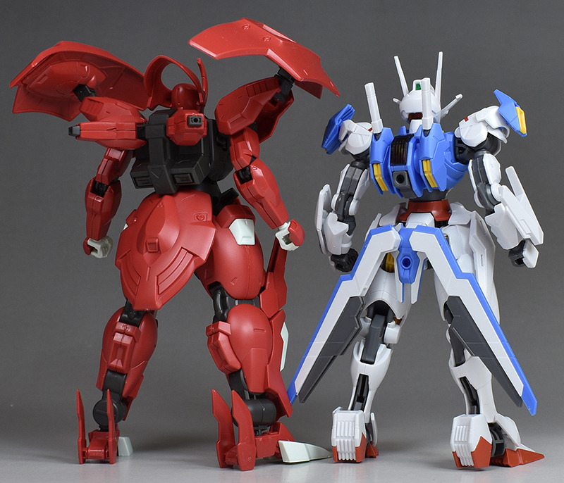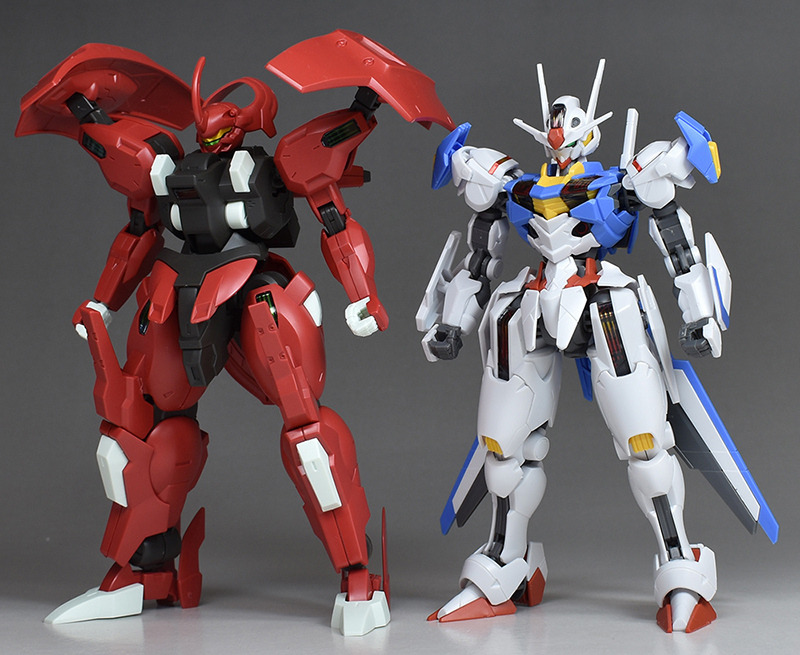 劇中で決闘を繰り広げたガンダムエアリアル(HGガンダムエアリアル)と並べて。なりふり構わず戦う両機、両者にはなかなか熱いものがありましたし、キャラクターの性格を反映した見応えのある決闘シーンでしたね。