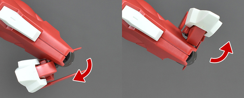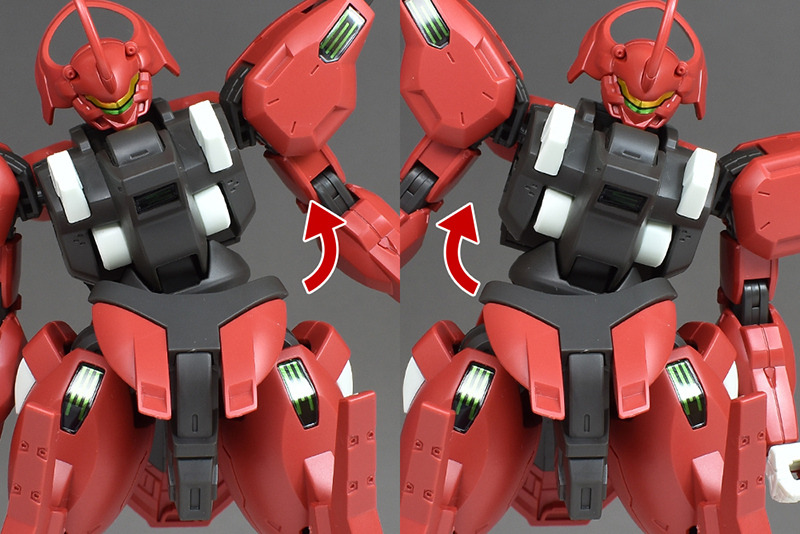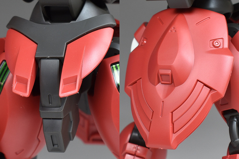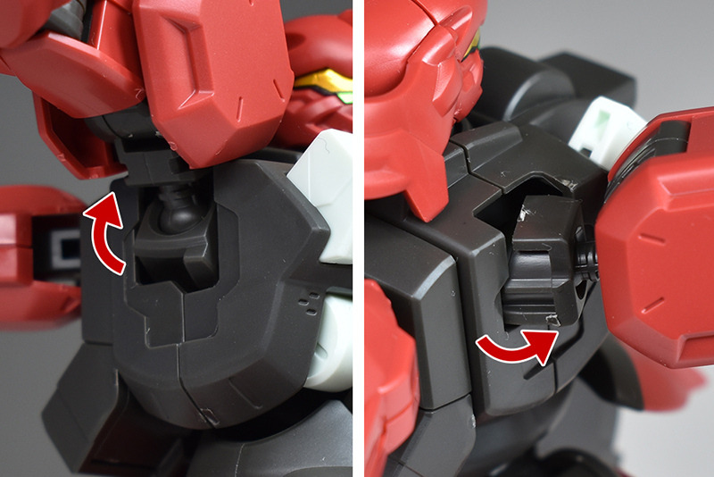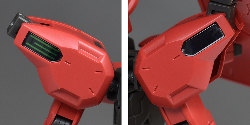 The shoulder armor is also relatively light. It is a front and back combination, but the seams are molded at the edges, so there is no flaw in the appearance. The front shell unit is reproduced by covering a sticker with clear parts. The hard points on the sides can be raised and lowered with hinge connections.