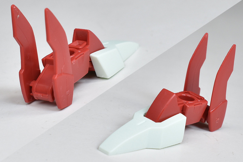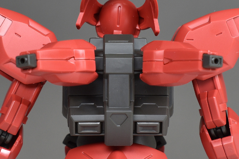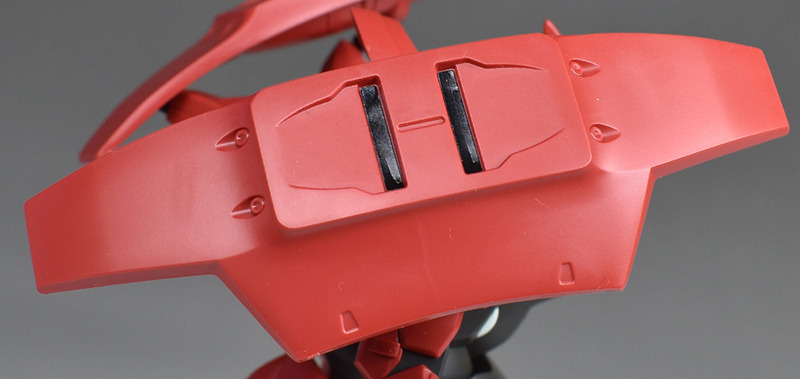 バックパック本体は2個パーツ構成で作り自体は簡易的。ですが合わせ目はモールド化されていて殆ど見えません。下部の角型スラスターもプレスのみでリアルに造形されています。