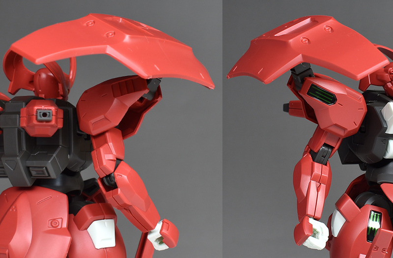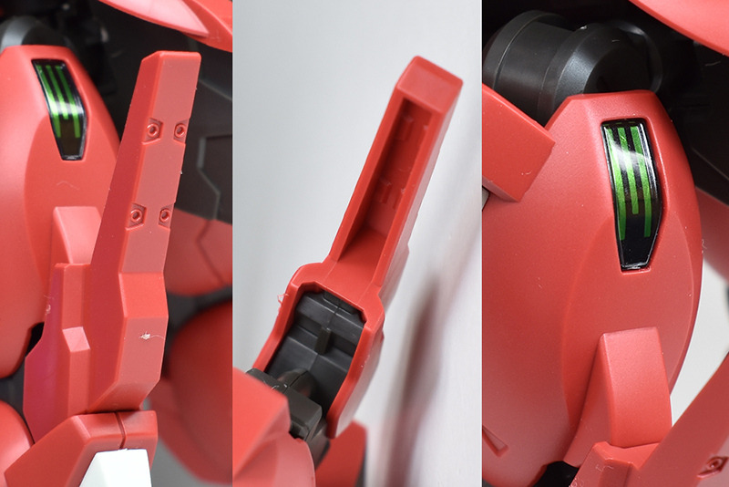 The drone defense unit on the shoulder, “Ambicar,” is a large shield-like armor. It is made up of surface armor, backing parts, and base parts, and the back side has a mechanical mold. The base can swing. It would be interesting to paint the backing parts differently. The slit-shaped shell unit on the surface is color-coded with stickers.
