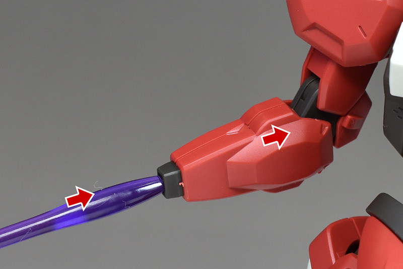 前腕にイーシュヴァラのBタイプを組み付け、その先端にビームサーベル刃を装備。ビーム刃はややきついくらいにしっかりと固定させることができます。クリアパープル成型色のビームサーベル刃は珍しいですね。