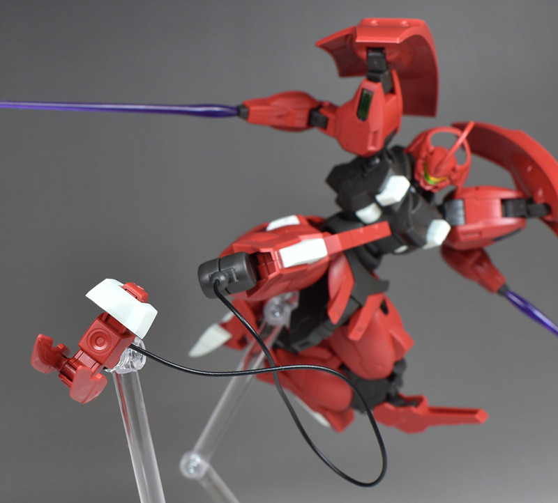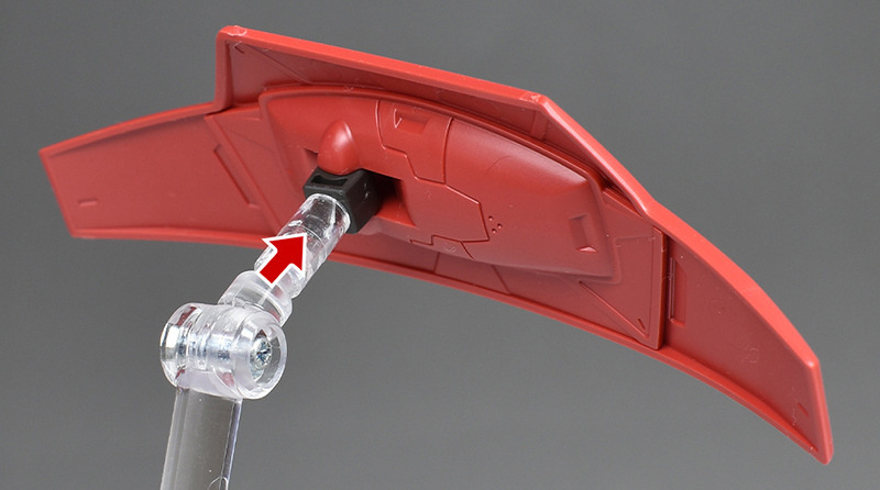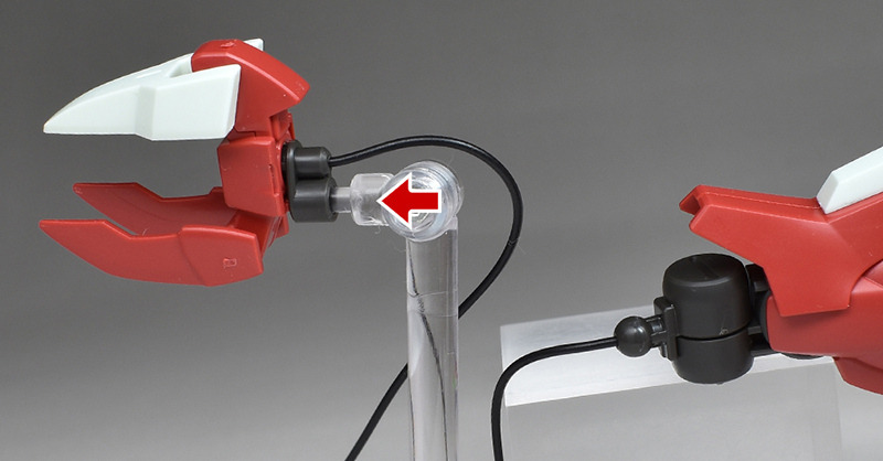 射出状態を再現する場合は付属のジョイントパーツを組み付けてリード線を接続します。脚部側のボールジョイント先にもリード線を接続。リード線はどちらも深くまで差し込め、簡単に抜けたりすることはありません。ジョイントパーツに3.0mm穴があるので、スタンドを使用することでシャクルクロウを浮かせた状態でディスプレイさせることができます。