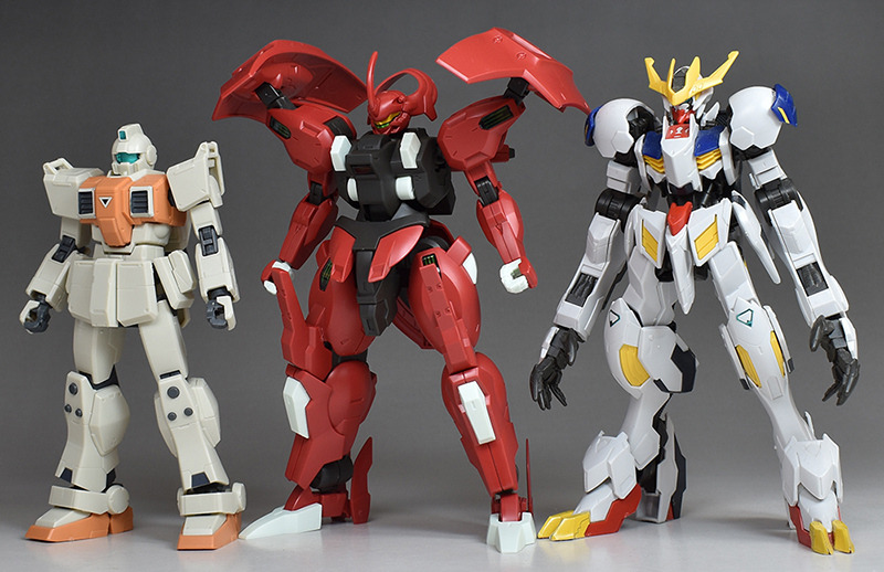 HG陸戦型ジム、HGルプスレクスと並べてサイズを比較。頭頂高自体は陸ジムよりも頭一つ分大きい程度ですが、肩にアンビカーがあるため、全高はだいぶ大きくなっています。