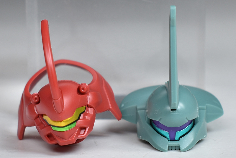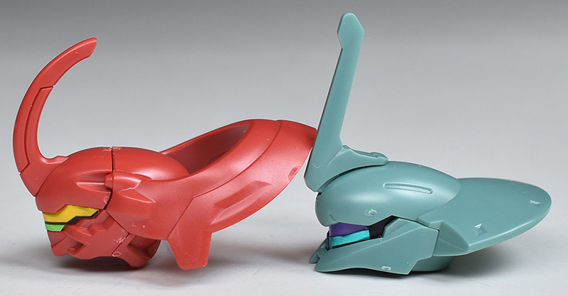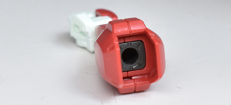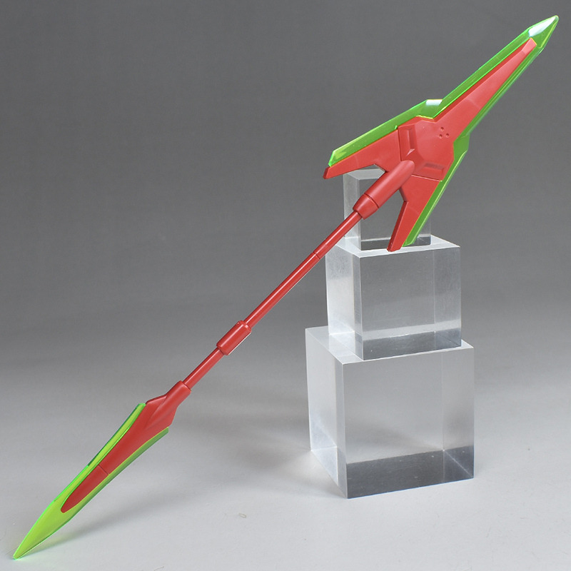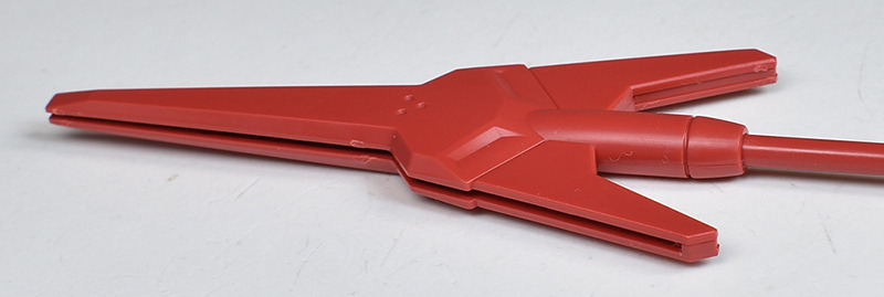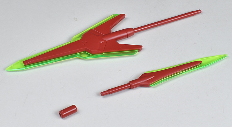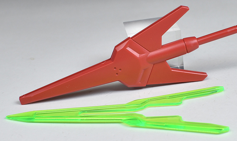 The molding color is a light red for the head and limbs, a brownish dark gray for the torso, and white for various parts of the body. In addition, the main camera on the head is yellow, the included weapon’s beam javelin blade is clear green, the beam saber blade is clear purple, and the included runnerless pedestal is reproduced in a clear molding color.
