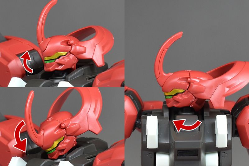 頭部の可動は、顎は深くまで引くことができますが、見上げる動きはわずか。左右へは多少顎が干渉しますが、水平までスイングさせることができます。