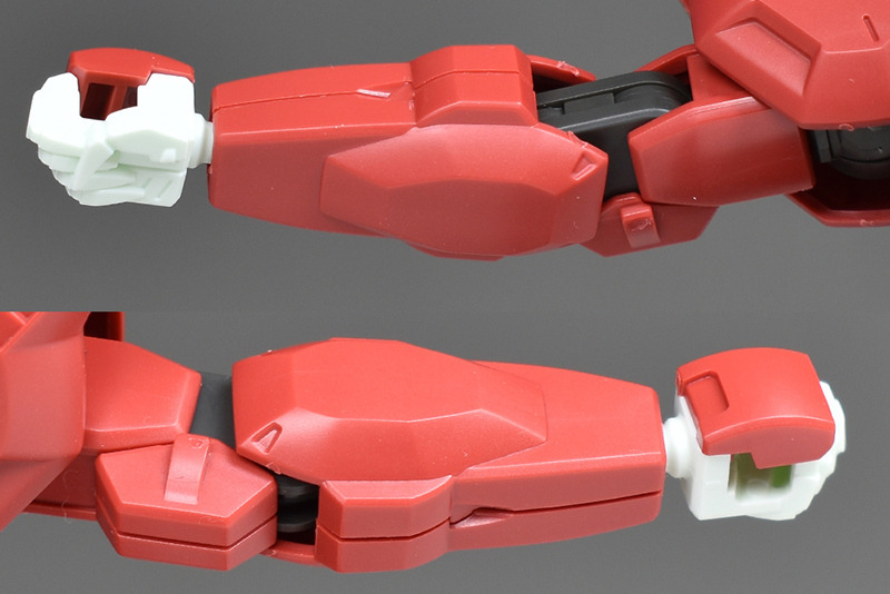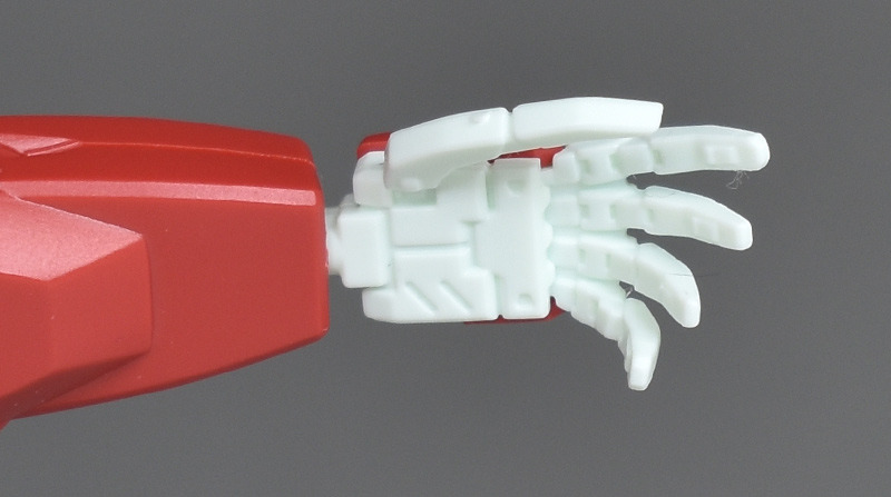 The upper arms are cylindrical with no seams. The forearms are simply made up of two parts, one on each side, but the seams between the front and back are molded in a stepped shape. The hand parts are reproduced in a rare white molding color.