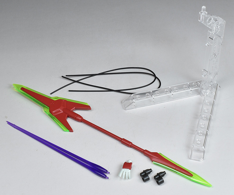 Includes beam javelin (beam anchor, beam kunai) (with 2 types of beam blades), 2 beam saber blades, 2 lead wires and 2 joint parts for Shakur Claws, flat hand (left), and a runnerless base in clear molded color.