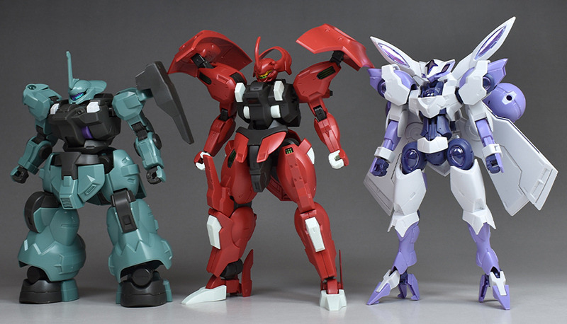 同シリーズの登場機であるHGディランザ(一般機/ラウダ専用機)、HG ベギルベウとも並べて。ディランザ一般機2機をあっという間に粉砕したシーンにはダリルバルデの性能や攻撃性の高さを感じました。