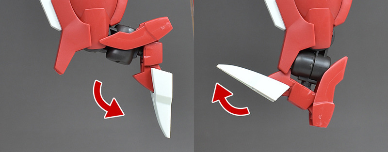 振り下ろす、断つ、突くといった様々なポーズが演出可能。細身で軽量な武装なので、重量で腕が垂れたりすることは全くないですし、肩のアンビカーとも干渉なく構えさせることができます。ただ、手甲パーツが少しでも浮いてくるとスルッと移動しやすくなるのでその点だけ注意です。