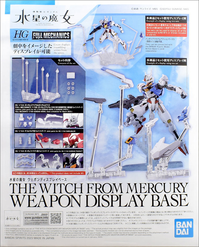 The Mercury Witch Weapon Display Base is a weapon display base that can display the Gambit used in the movie Mobile Suit Gundam: The Mercury Witch. By combining it with the HG Mercury Witch series kit (sold separately), you can recreate the Gambit deployment image just like in the movie. Joint parts that can be connected to the separately sold action base are also included. The price is 550 yen (tax included).