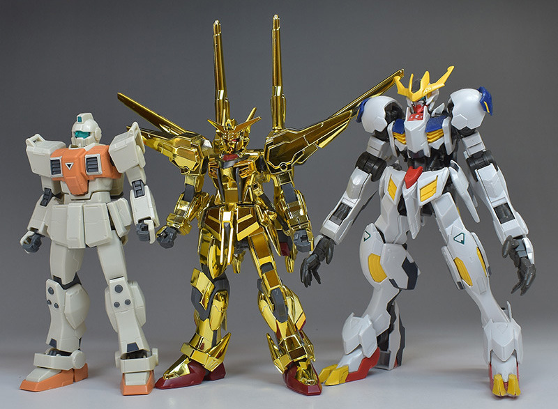 HG陸戦型ジム、HGルプスレクスと並べてサイズを比較。HG SEEDシリーズなので比較的小柄。本体部分だけだと陸ジムよりも小さいくらいですが、背部ユニットが大柄なため、その分幅と高さが増しています。シラヌイアカツキの全高は18.74m。