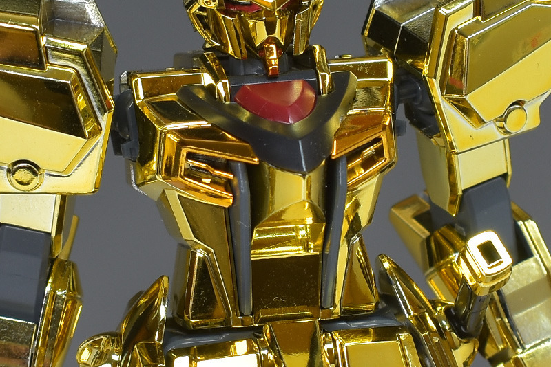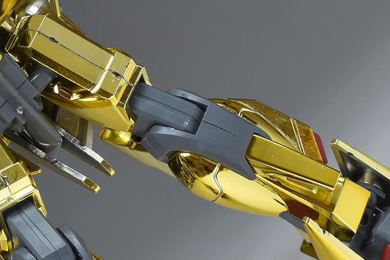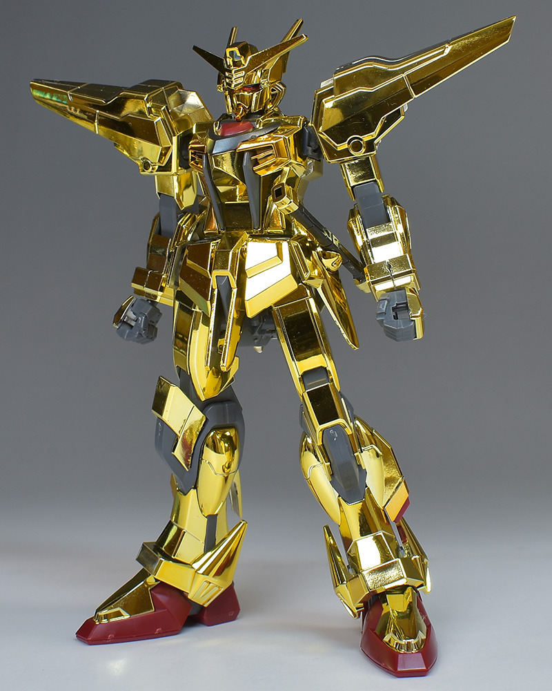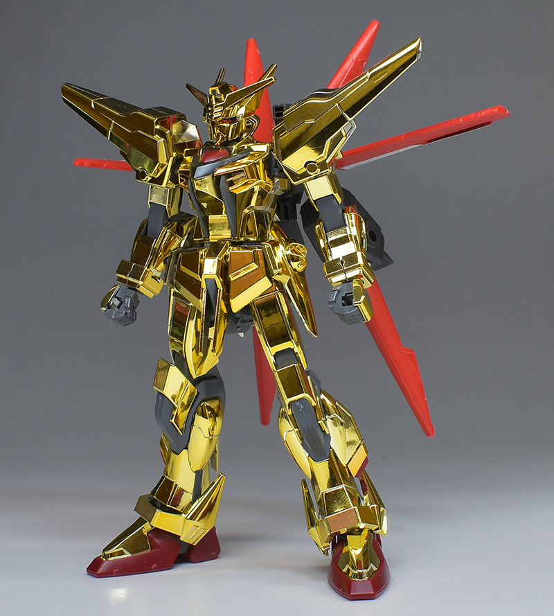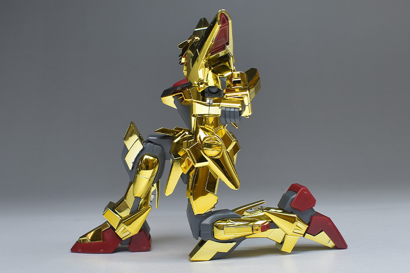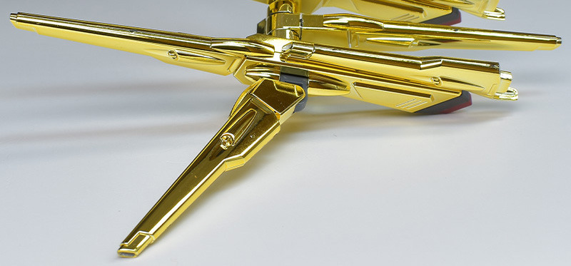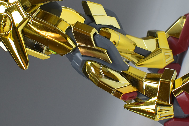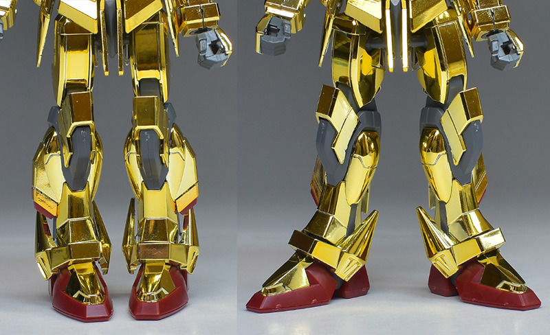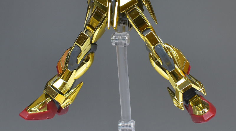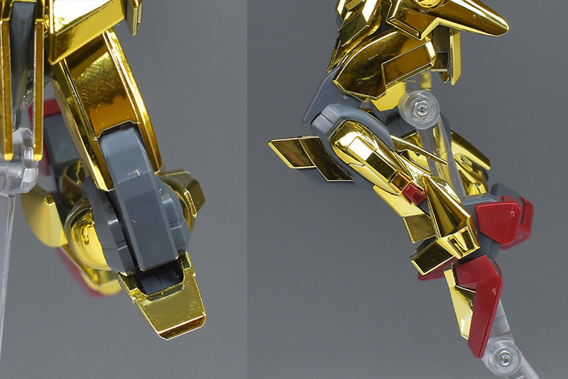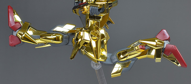 The entire body is molded in gold. The chest air intakes and leg thruster ports are plated in a slightly reddish gold. Other parts are wine red for the chest and soles, black for the chest and saber handle, and gray for the abdomen, knees, internal joints, and weapons.