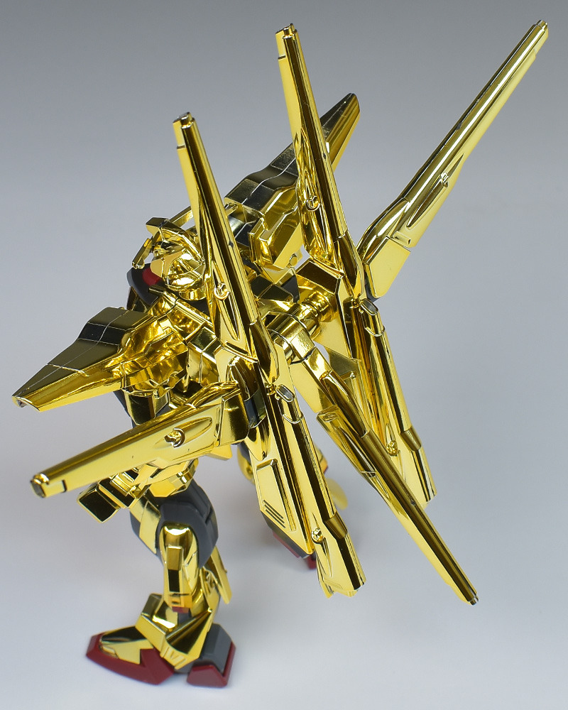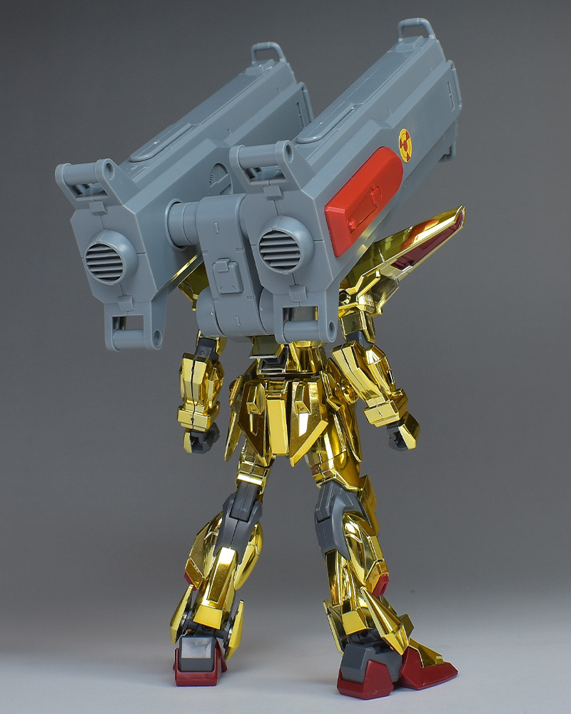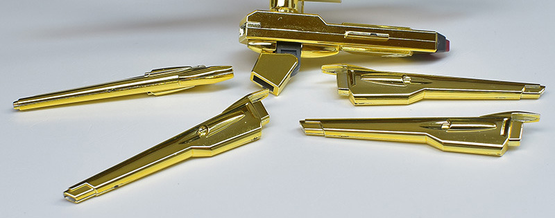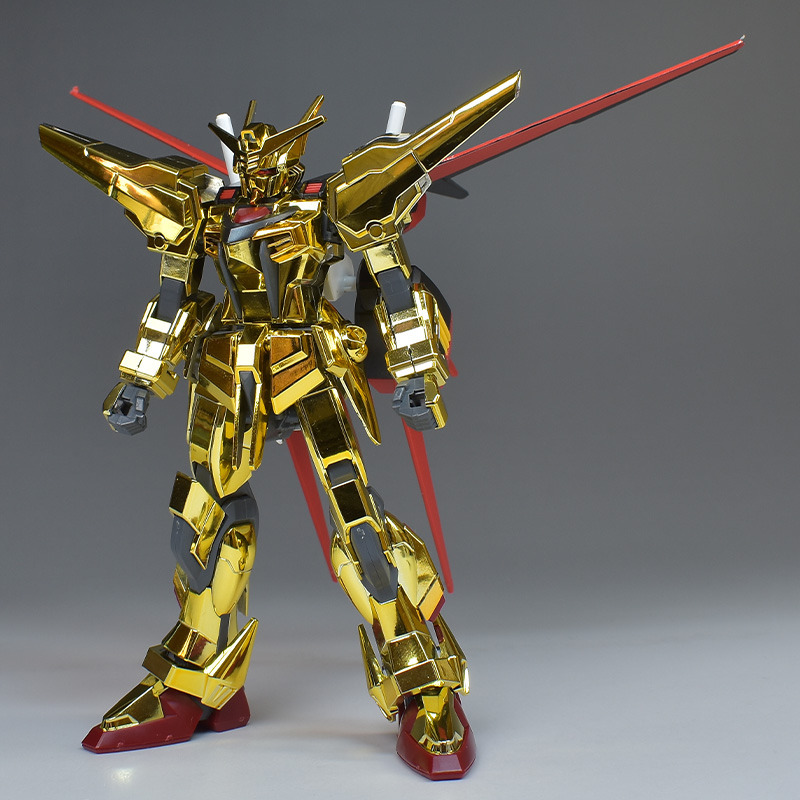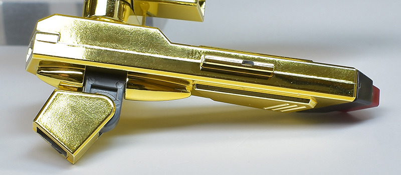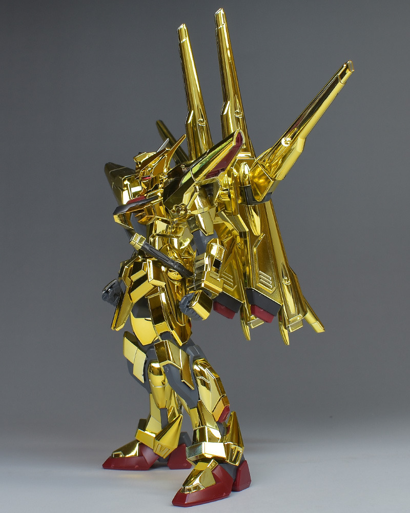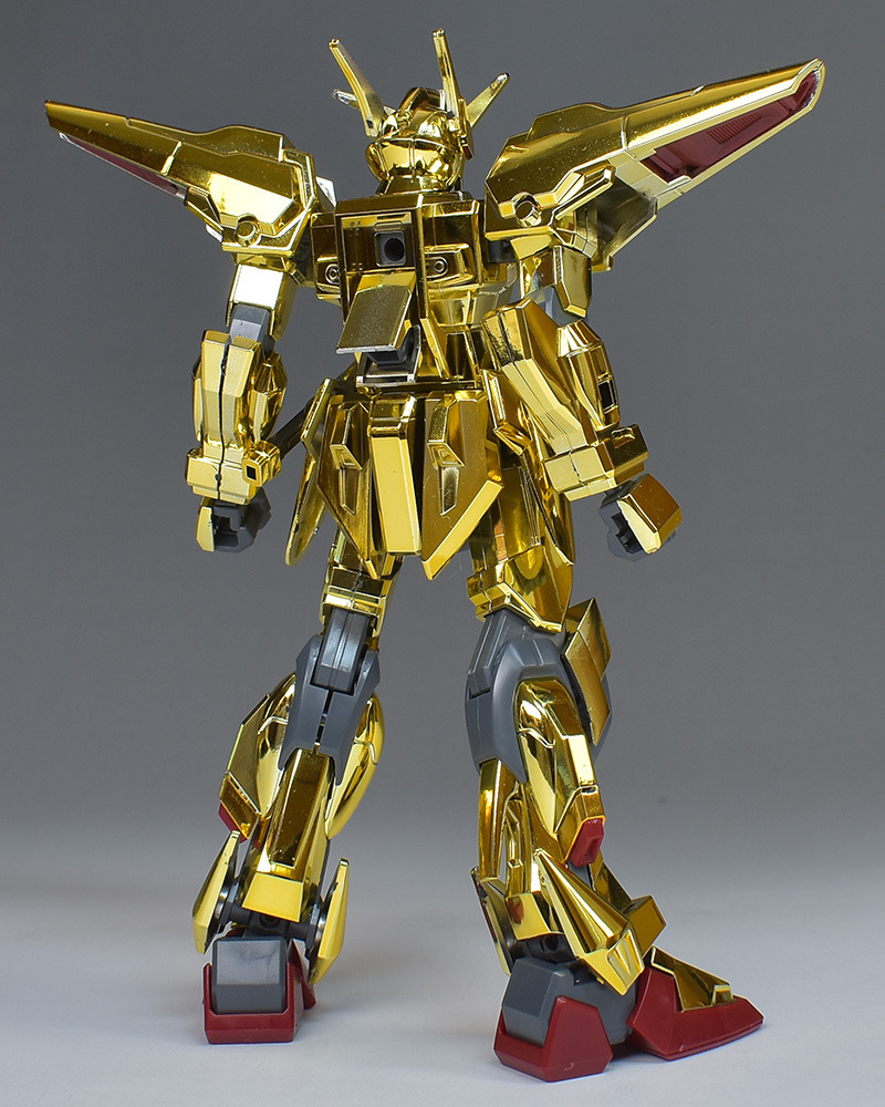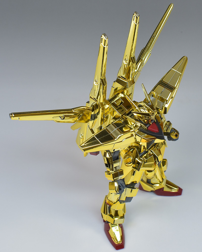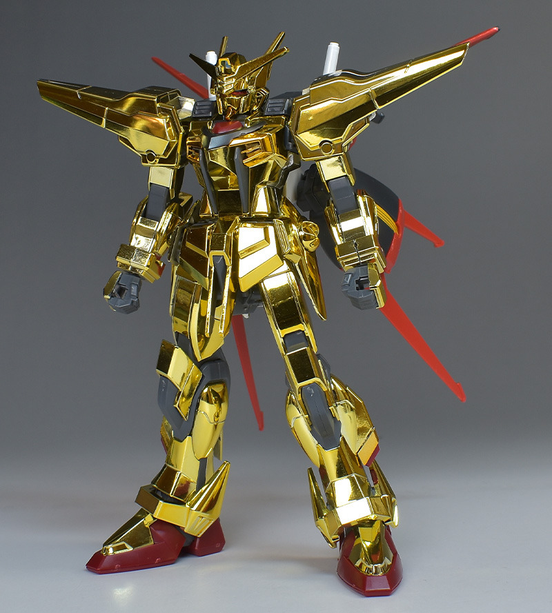 The entire body is molded in gold. The chest air intakes and leg thruster ports are plated in a slightly reddish gold. Other parts are wine red for the chest and soles, black for the chest and saber handle, and gray for the abdomen, knees, internal joints, and weapons.