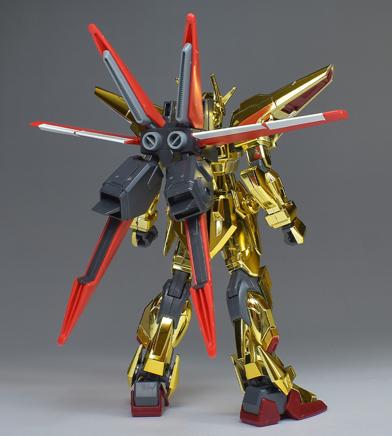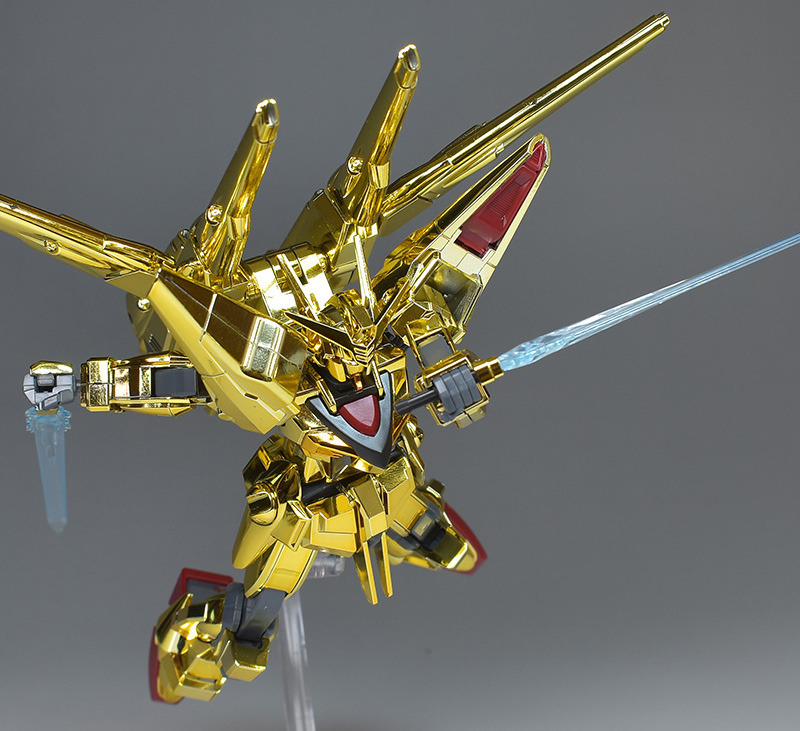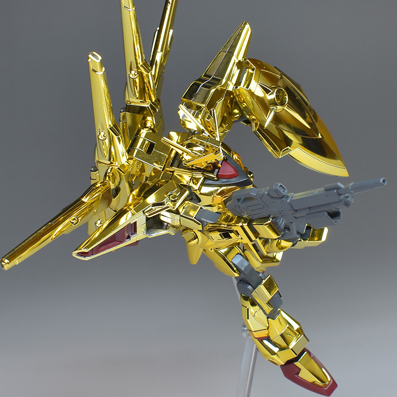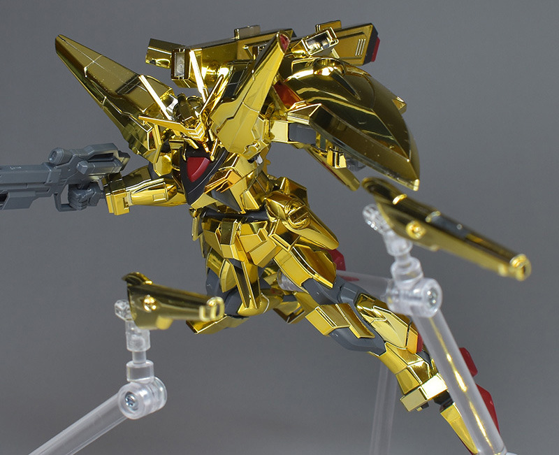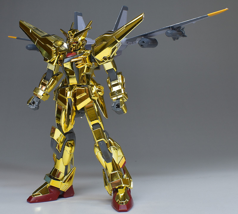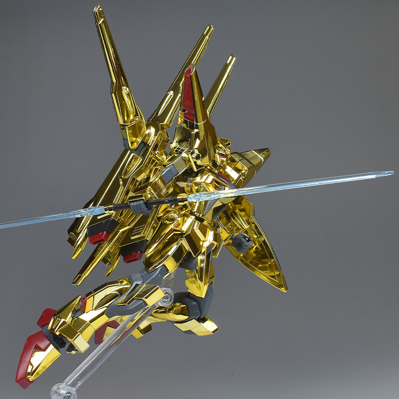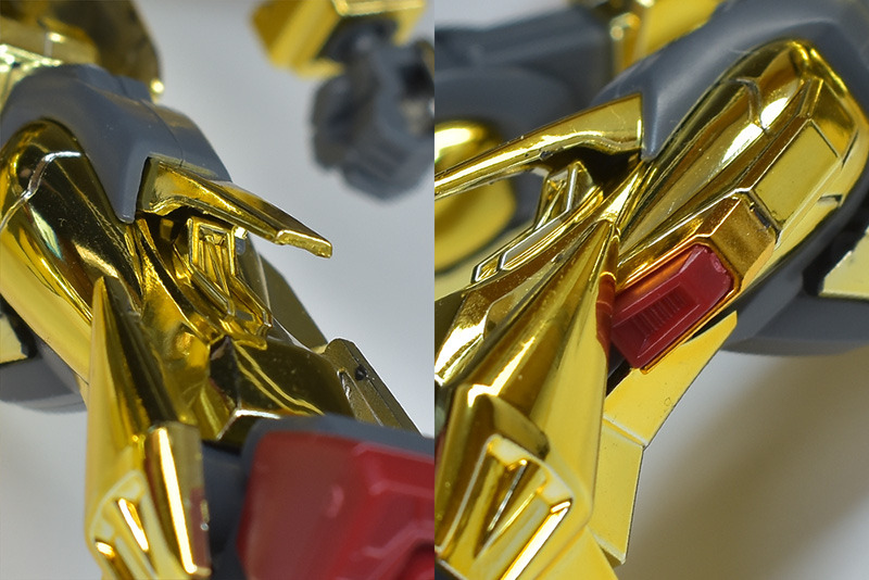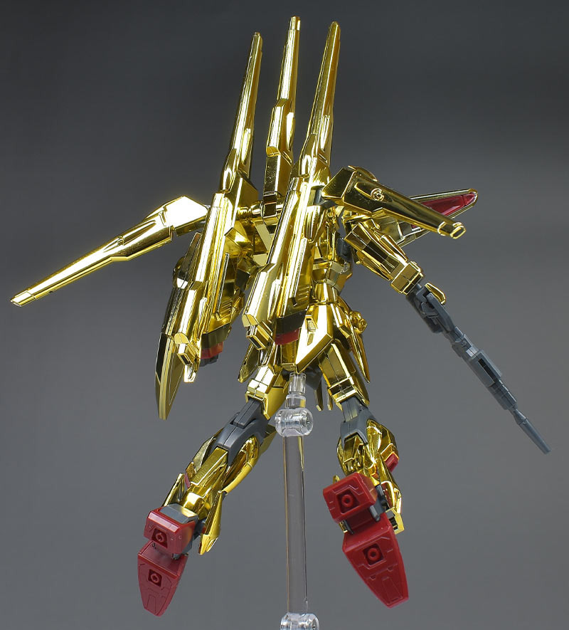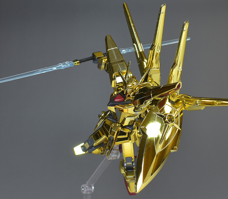 The entire body is molded in gold. The chest air intakes and leg thruster ports are plated in a slightly reddish gold. Other parts are wine red for the chest and soles, black for the chest and saber handle, and gray for the abdomen, knees, internal joints, and weapons.