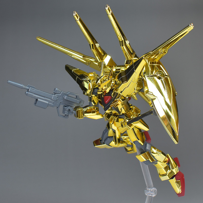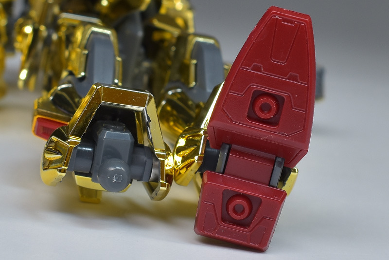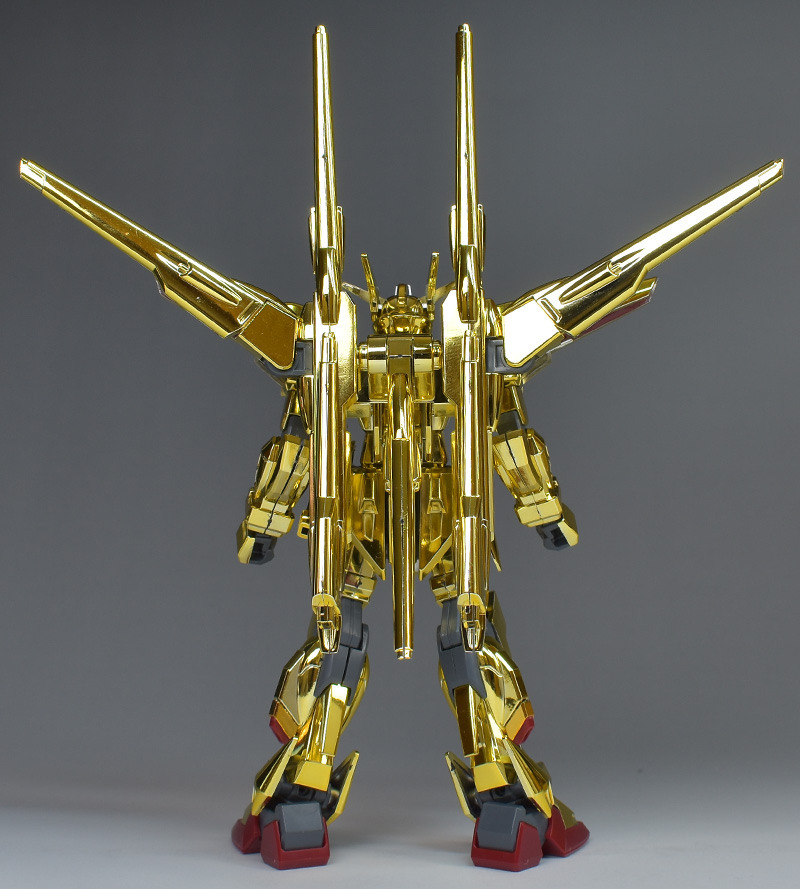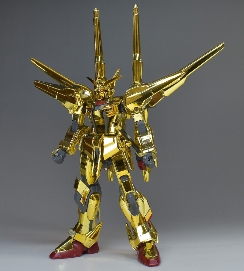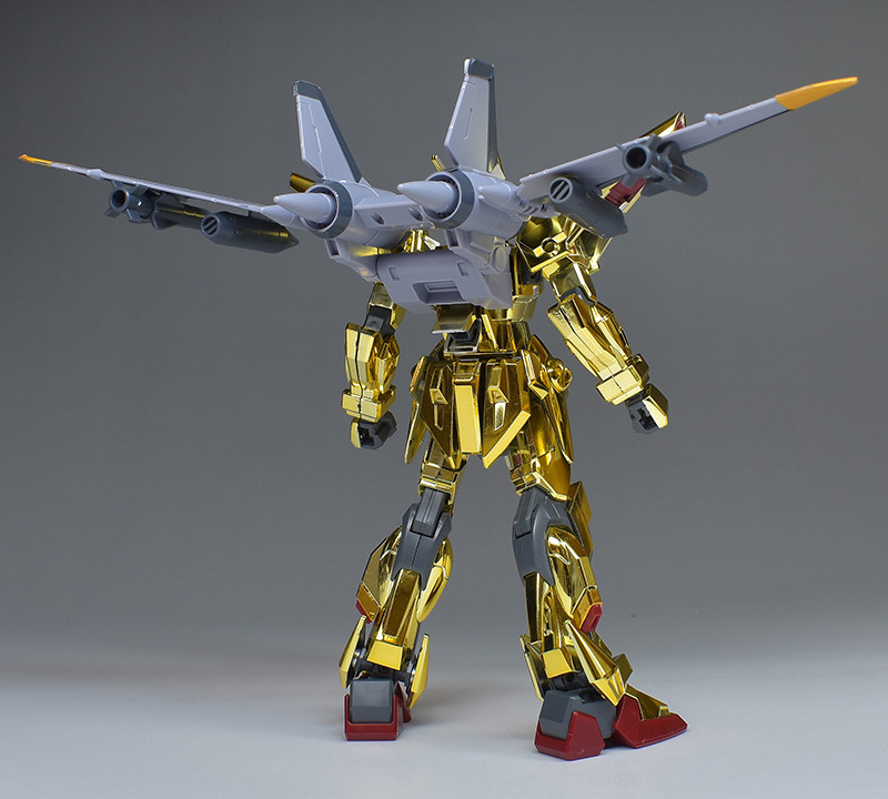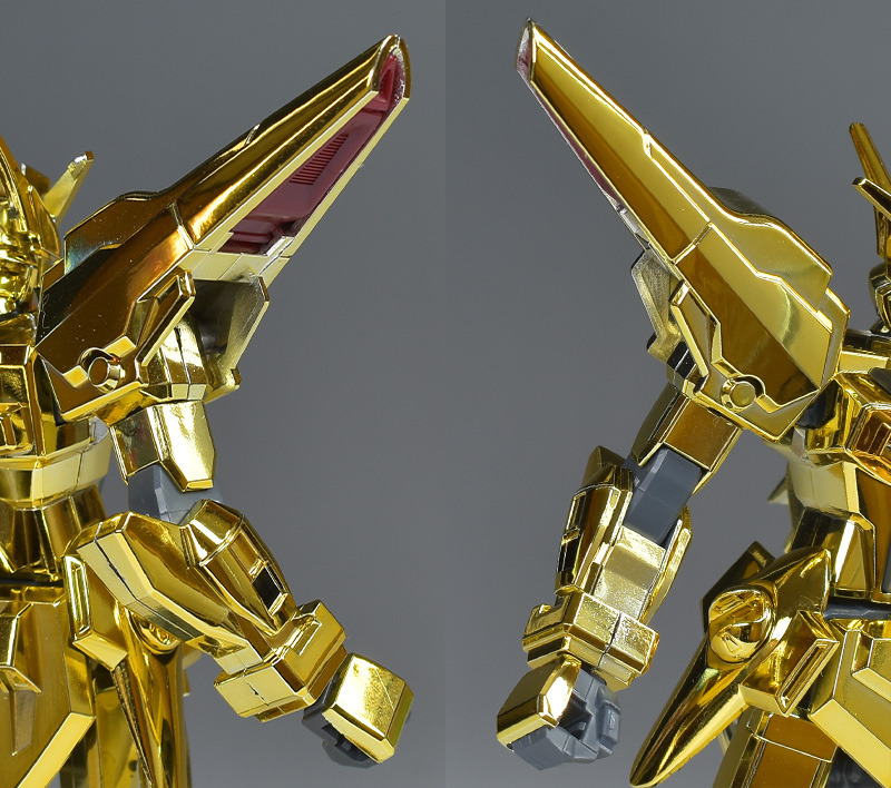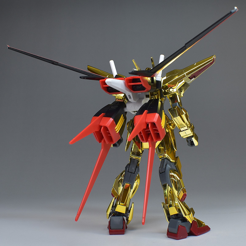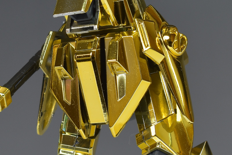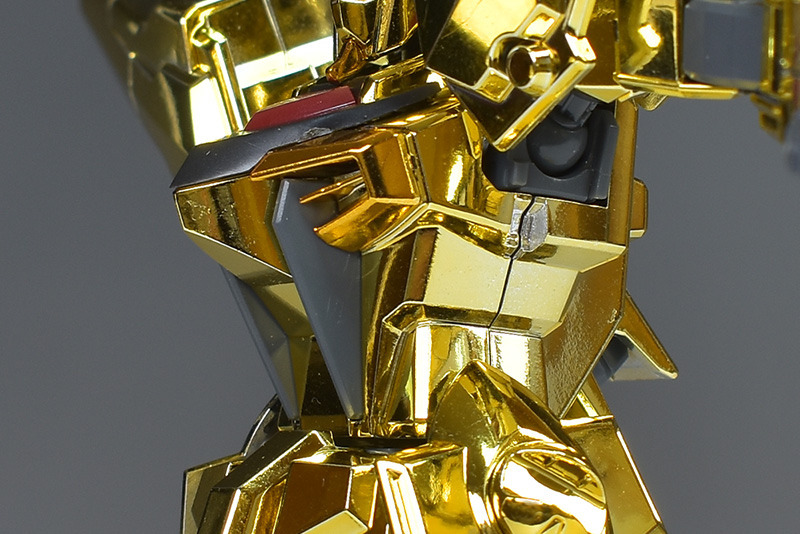The entire body is molded in gold. The chest air intakes and leg thruster ports are plated in a slightly reddish gold. Other parts are wine red for the chest and soles, black for the chest and saber handle, and gray for the abdomen, knees, internal joints, and weapons.