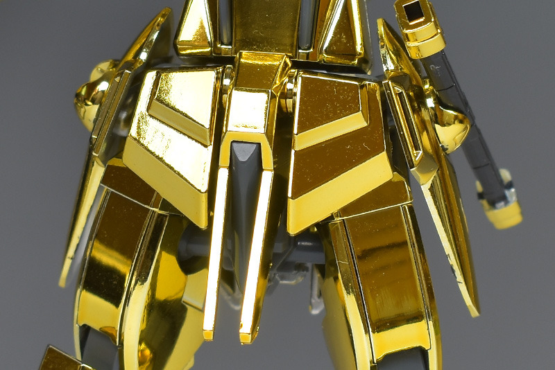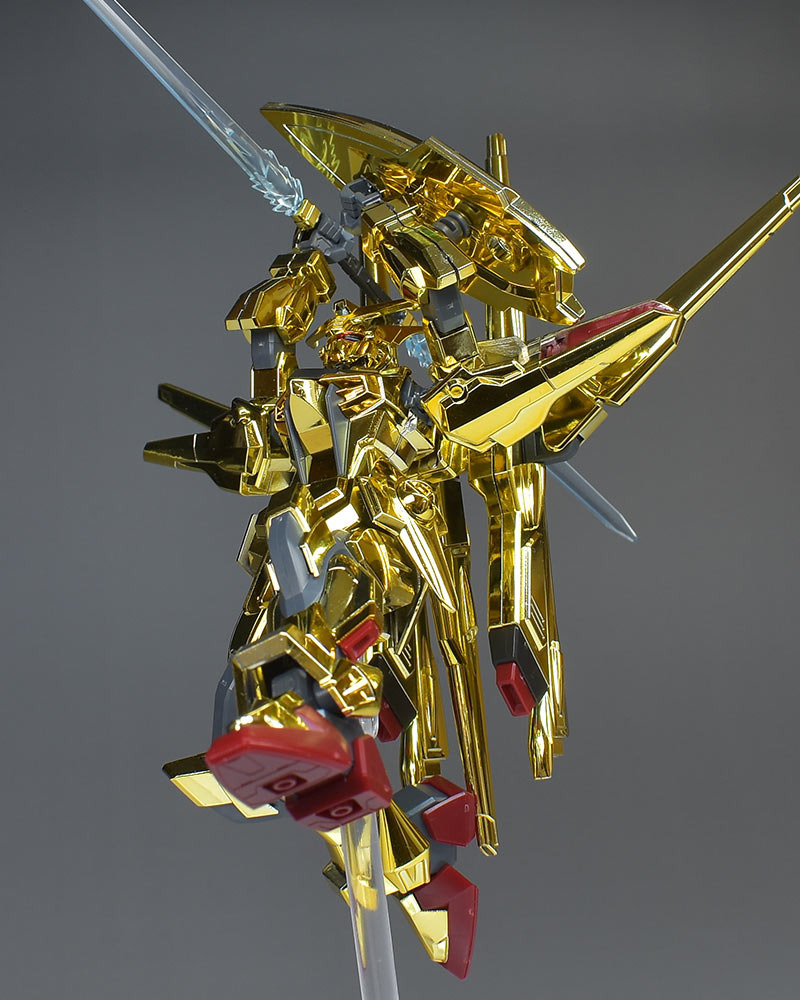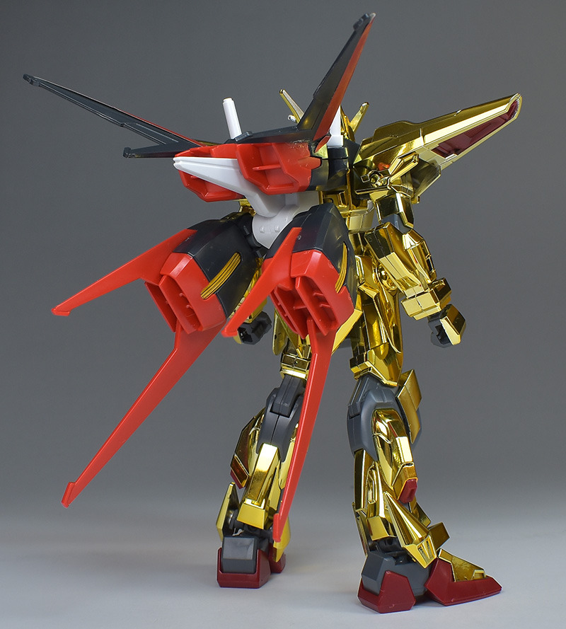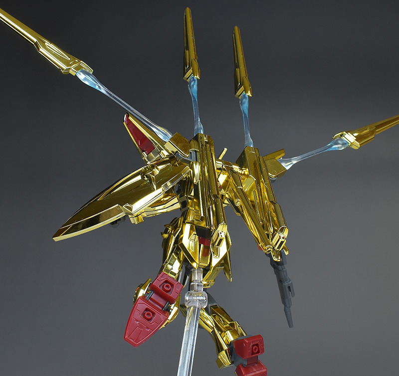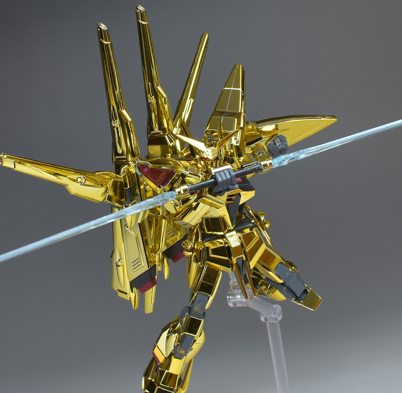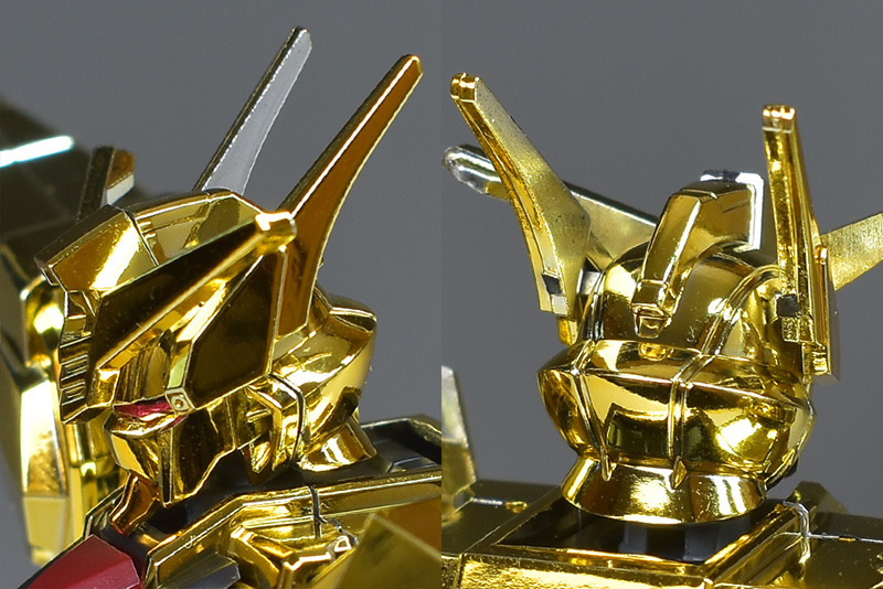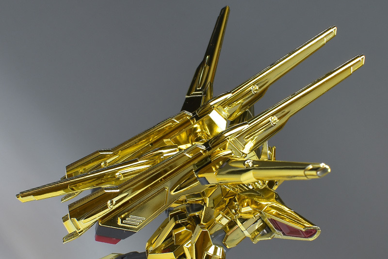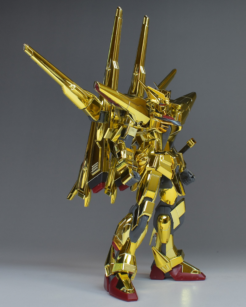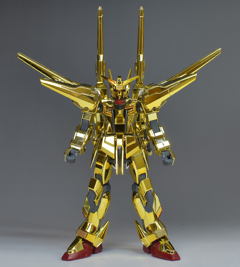 The entire body is molded in gold. The chest air intakes and leg thruster ports are plated in a slightly reddish gold. Other parts are wine red for the chest and soles, black for the chest and saber handle, and gray for the abdomen, knees, internal joints, and weapons.