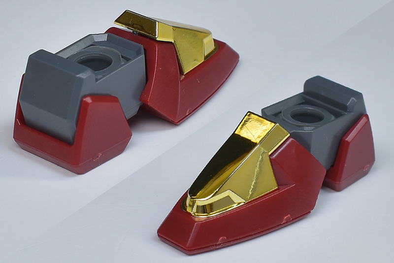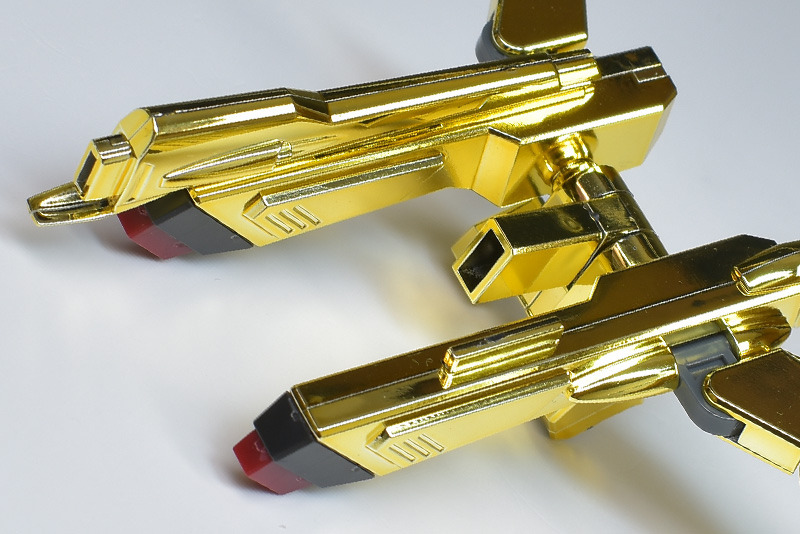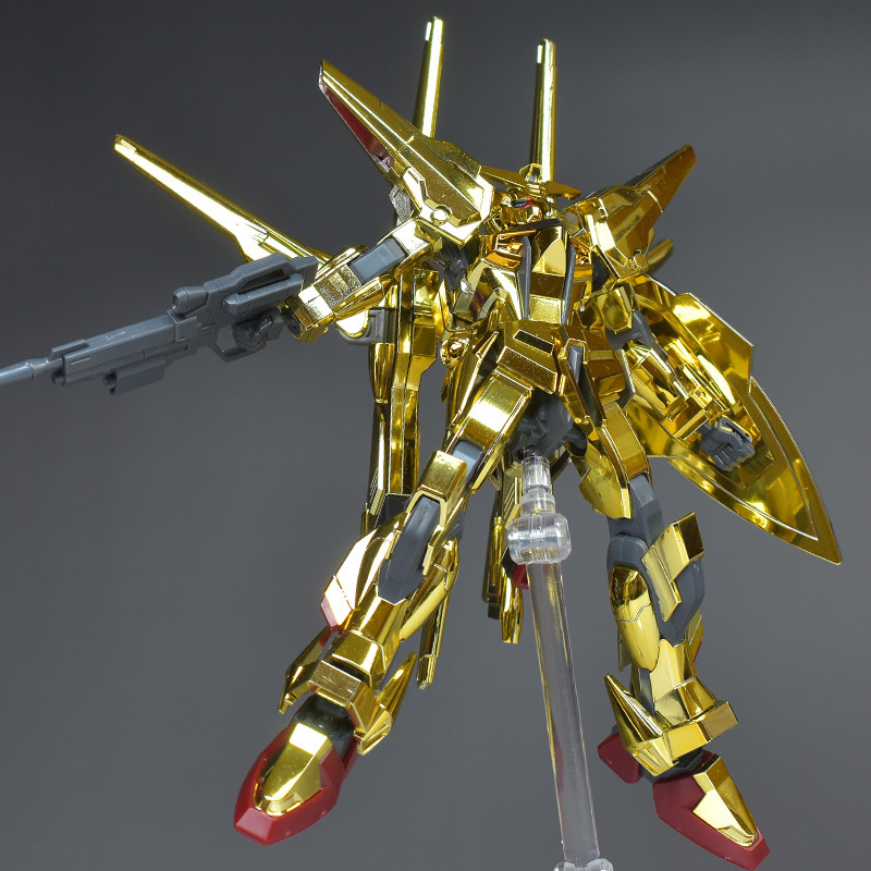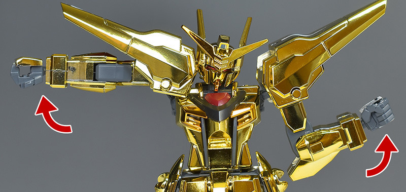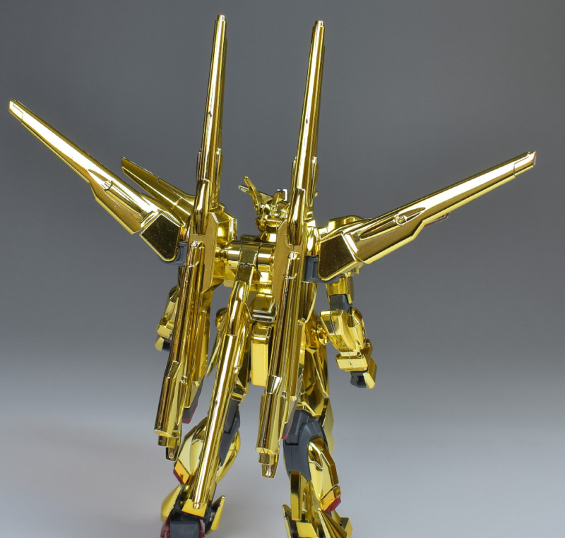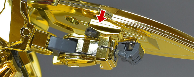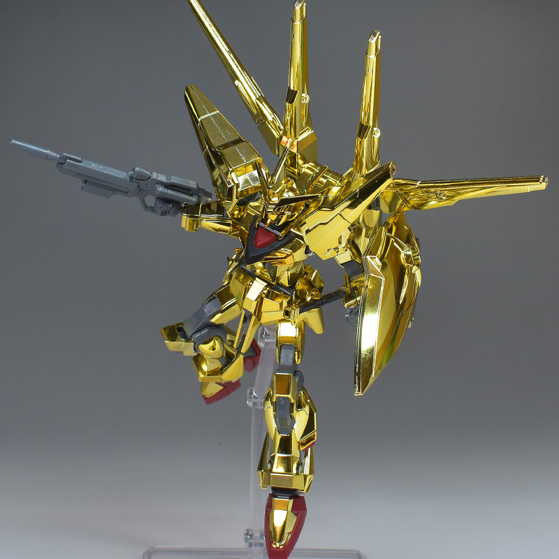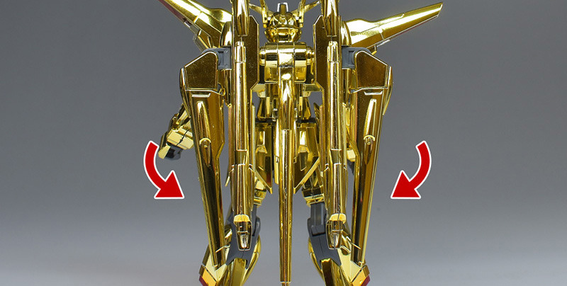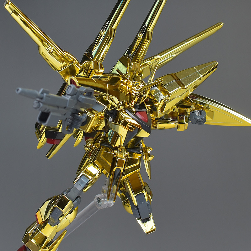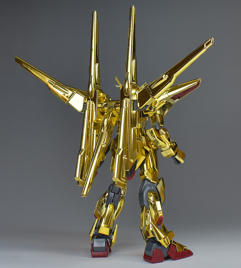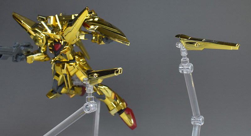 The entire body is molded in gold. The chest air intakes and leg thruster ports are plated in a slightly reddish gold. Other parts are wine red for the chest and soles, black for the chest and saber handle, and gray for the abdomen, knees, internal joints, and weapons.