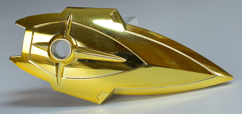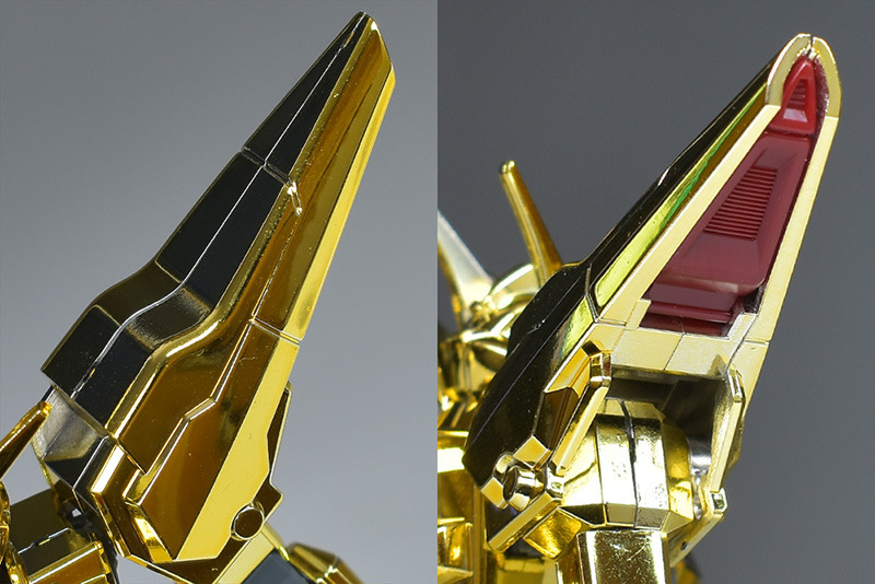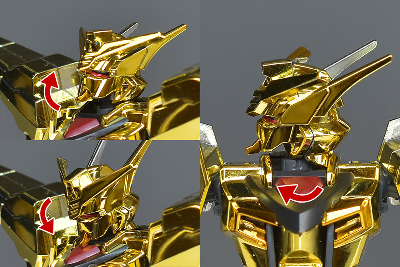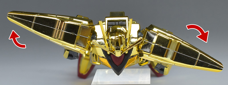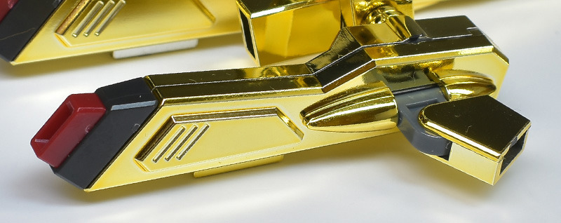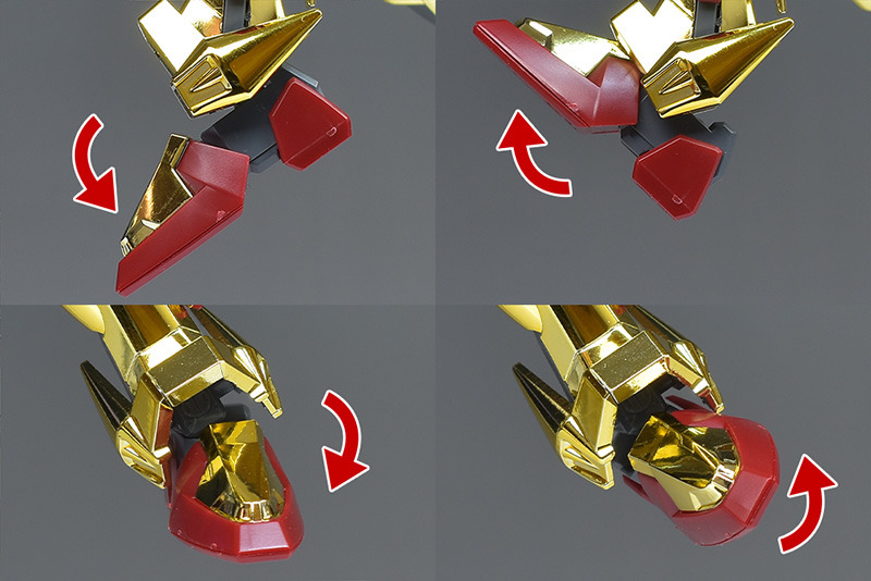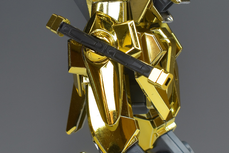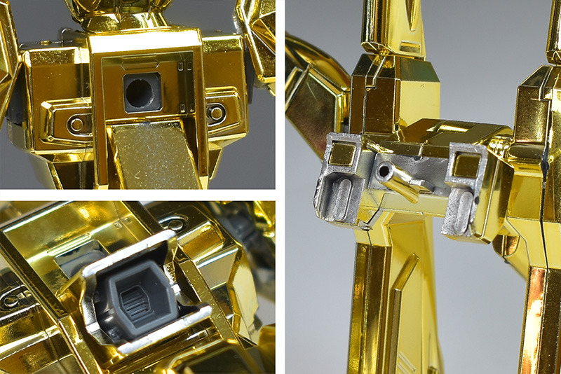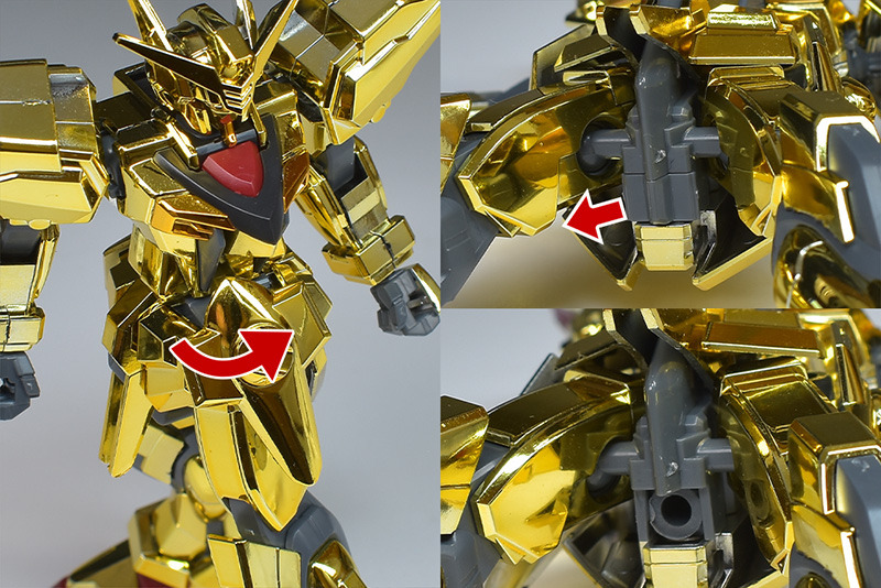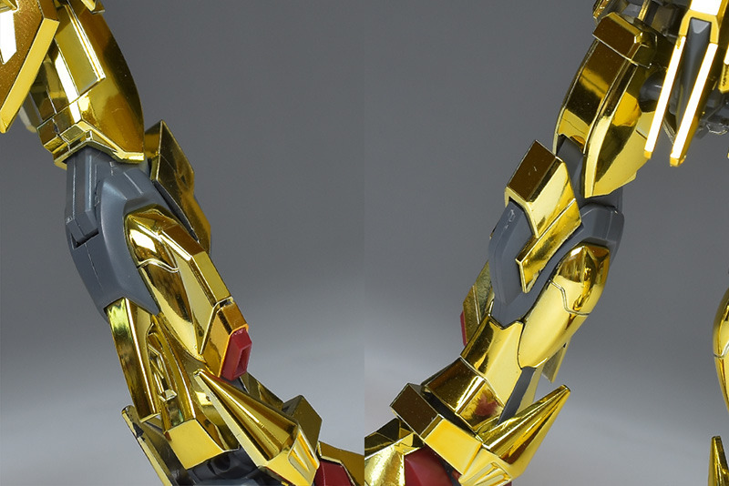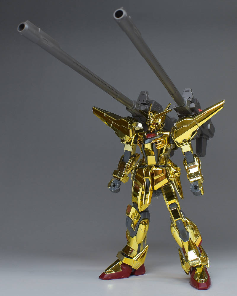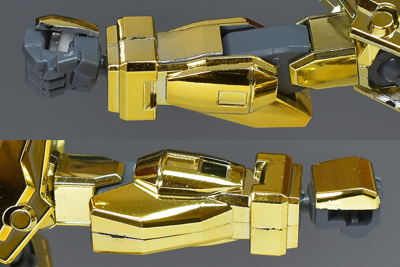 The entire body is molded in gold. The chest air intakes and leg thruster ports are plated in a slightly reddish gold. Other parts are wine red for the chest and soles, black for the chest and saber handle, and gray for the abdomen, knees, internal joints, and weapons.