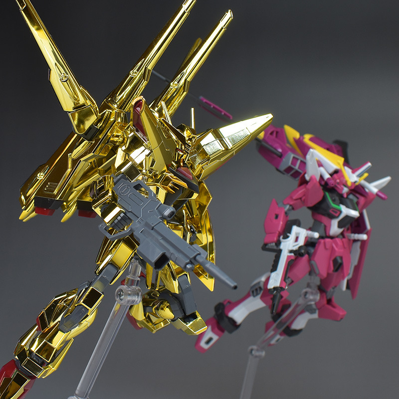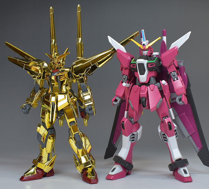 劇中で共にレクイエムを撃破したインフィニットジャスティス(HGCE インフィニットジャスティスガンダム)とも並べて。