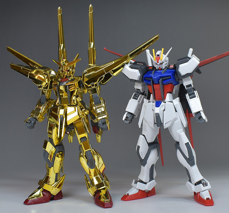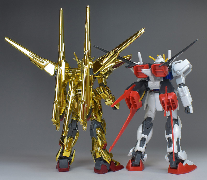 設計が流用されたため、構造に共通点が見られるというストライクガンダム(HG SEED エールストライクガンダム 2002年11月発売)と並べて。発売時期に4年ほどの差がありますが、アカツキのほうが脚長でプロポーションが良く見えますね。