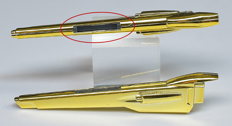 ユニット基部の上側に組み付けるビーム砲も左右の組み合わせで上下に合わせ目ができますが、一部ジョイント穴(赤◯)が造形。グレーのパーツが内側に組み込んであり、固定できる構造になっています。